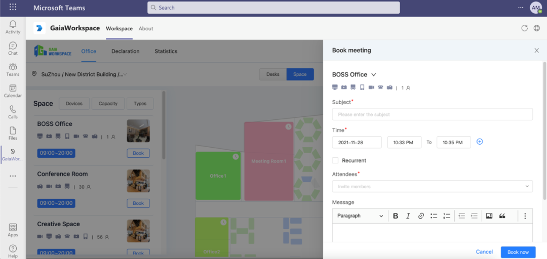 作为即将在Teams上架的应用,Workspace和Gaiascreen与Teams做到了深度融合,包括不需要繁琐的二次登陆、菜单栏日历会提醒所有信息、直接在手机应用扫码等。