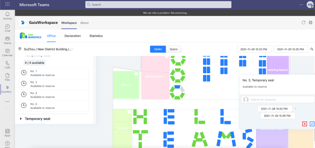 Workspace具有会议室和办公桌管理、员工筛选、疫苗和测试跟踪以及任务管理功能。大楼的所有者或企业主只需要在Teams中打开应用,配置好相应的桌椅、会议室以及办公物品,即可供企业员工或个人来访者预定。