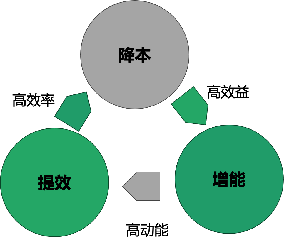 持续改善对应我们谈到的人效飞轮,我也需要为前面提到的“提效降本”模式再扩充一下,即“提效-降本-赋能”模式。