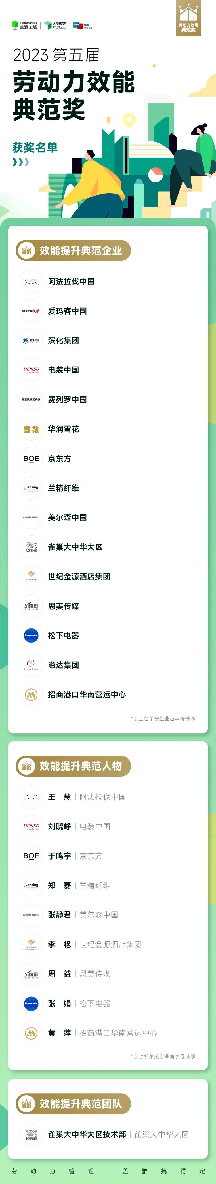 同时,本届评选还发布了「2023 劳动力效能典范奖」效能提升典范人物、「2023 劳动力效能典范奖」效能提升典范团队两大奖项,以表彰其在企业劳动力效能管理方面起到的引领作用,肯定其为企业劳动力效能提升作出的巨大贡献。
