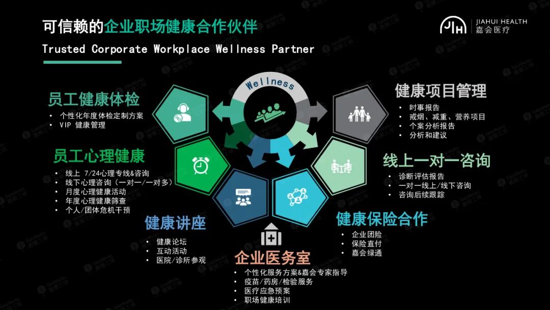 企业合作上、大家能想到、想不到的和医疗健康有关的服务,嘉会都可以支持,欢迎一起探讨为了员工的健康福利,我们可以共同做些什么。