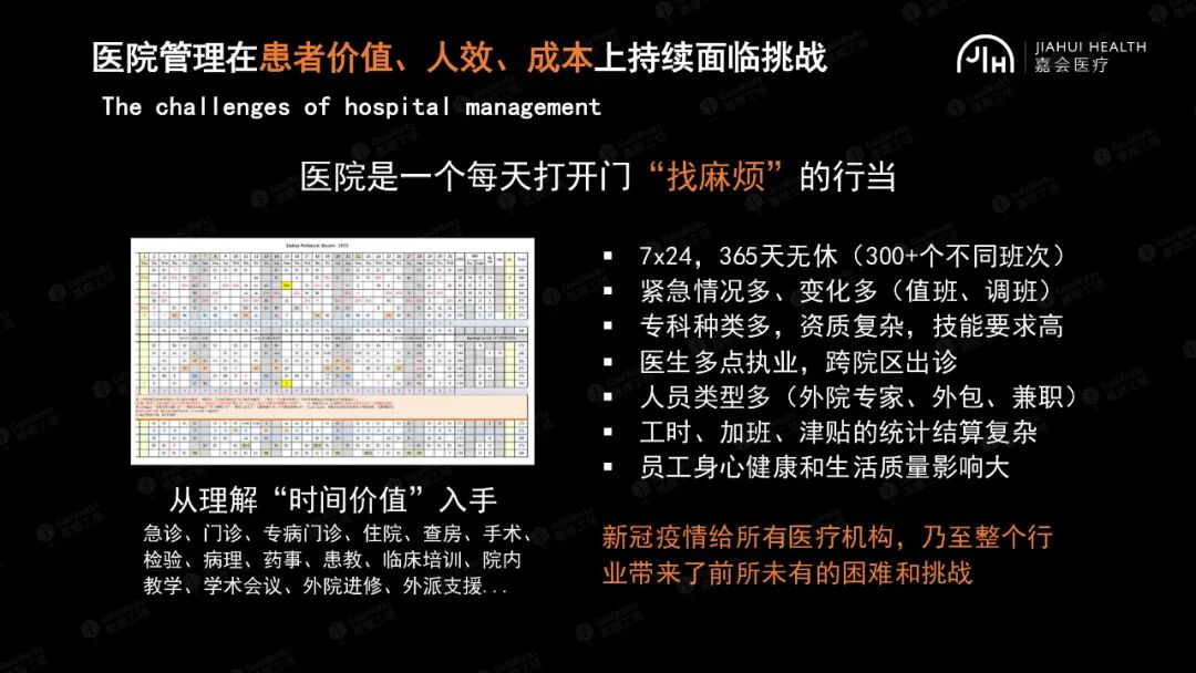 我印象非常深刻,新冠疫情时我们没有排班系统:每天早上打开医院的门,我不知道今天谁能来上班、不知道哪个医生能来、谁又被关在小区里。但同时医院是“打开门找麻烦”的行当,我不知道下一秒钟进来哪个患者、哪个客户、他有什么问题,我有没有能力解决他的问题。